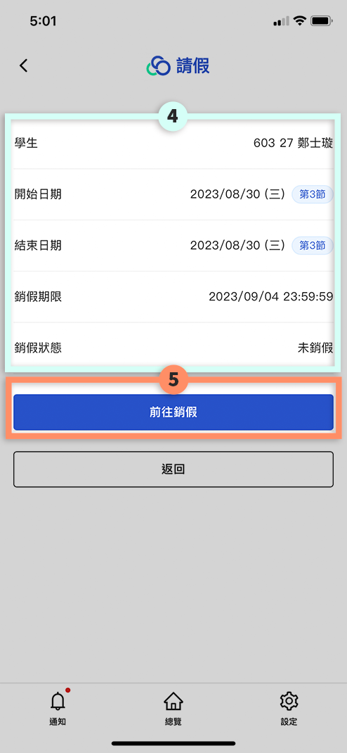 顯示學生曠課時間以及最後可申請銷假的期限與銷假狀態。